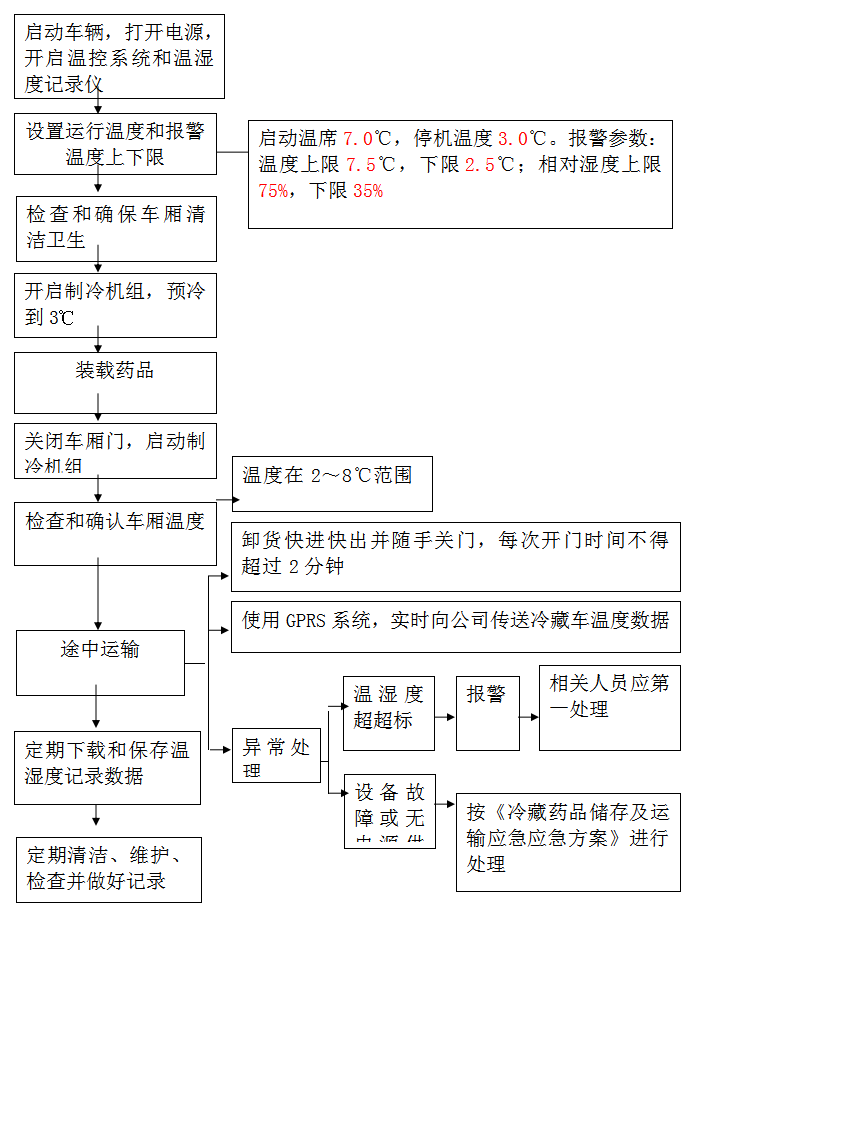 2、運輸冷藏藥品時,應(yīng)事先發(fā)出運行通知,標(biāo)明運行方式、線路、運輸人員、異常情況處理方案等事項。